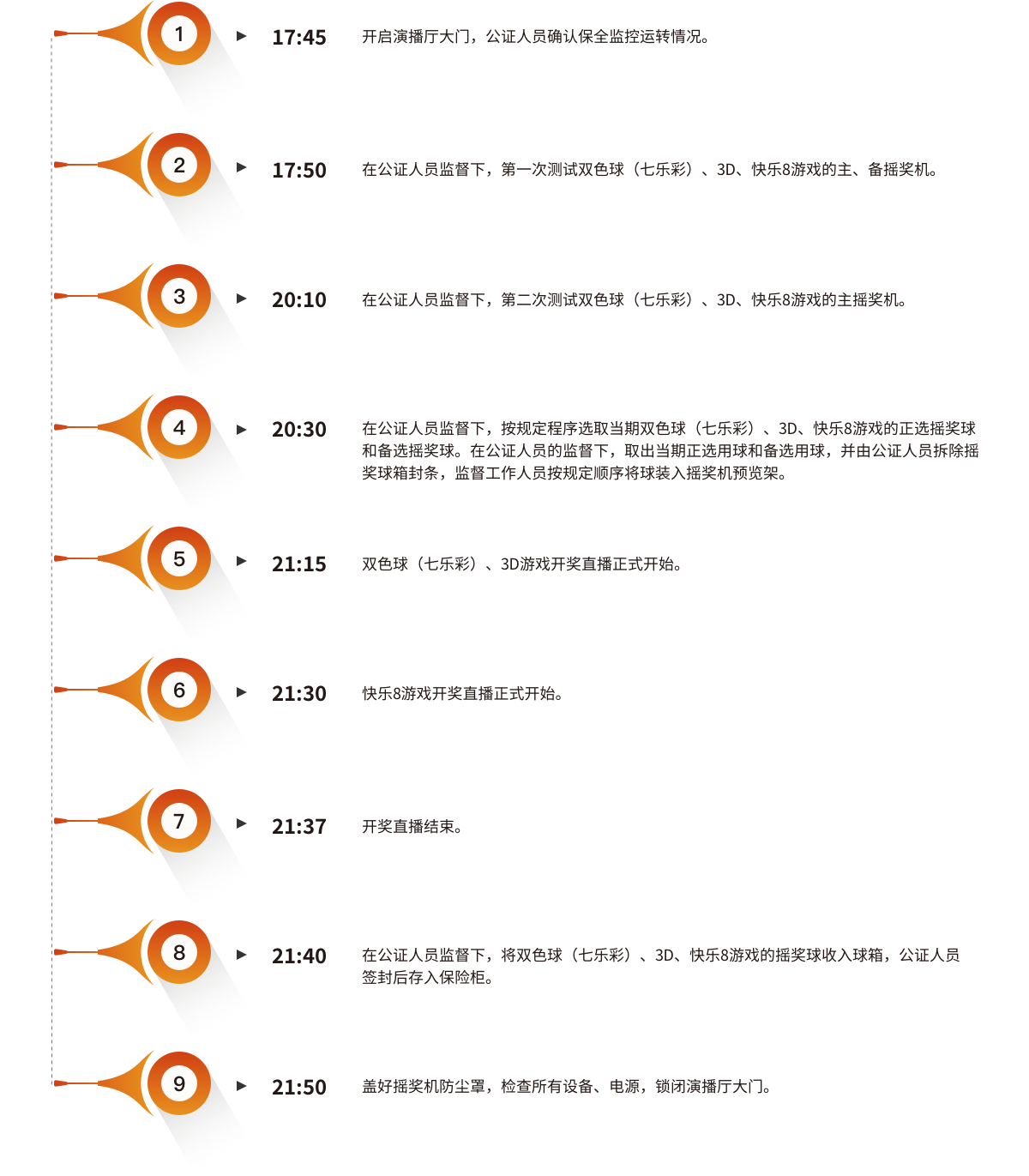 中国福利彩票双色球(七乐彩)、3D游戏、快乐8游戏开奖直播工作流程如下: